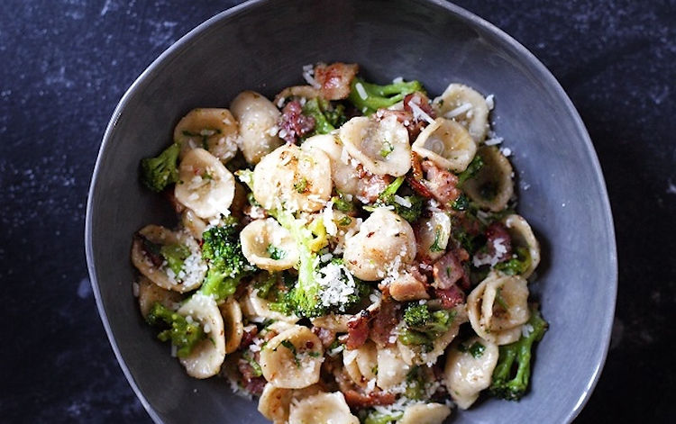 Add the broccoli florets and deglaze with white wine (it’s OK if the broccoli is slightly overcooked, as this will result in small pieces breaking off and sticking to the pasta).